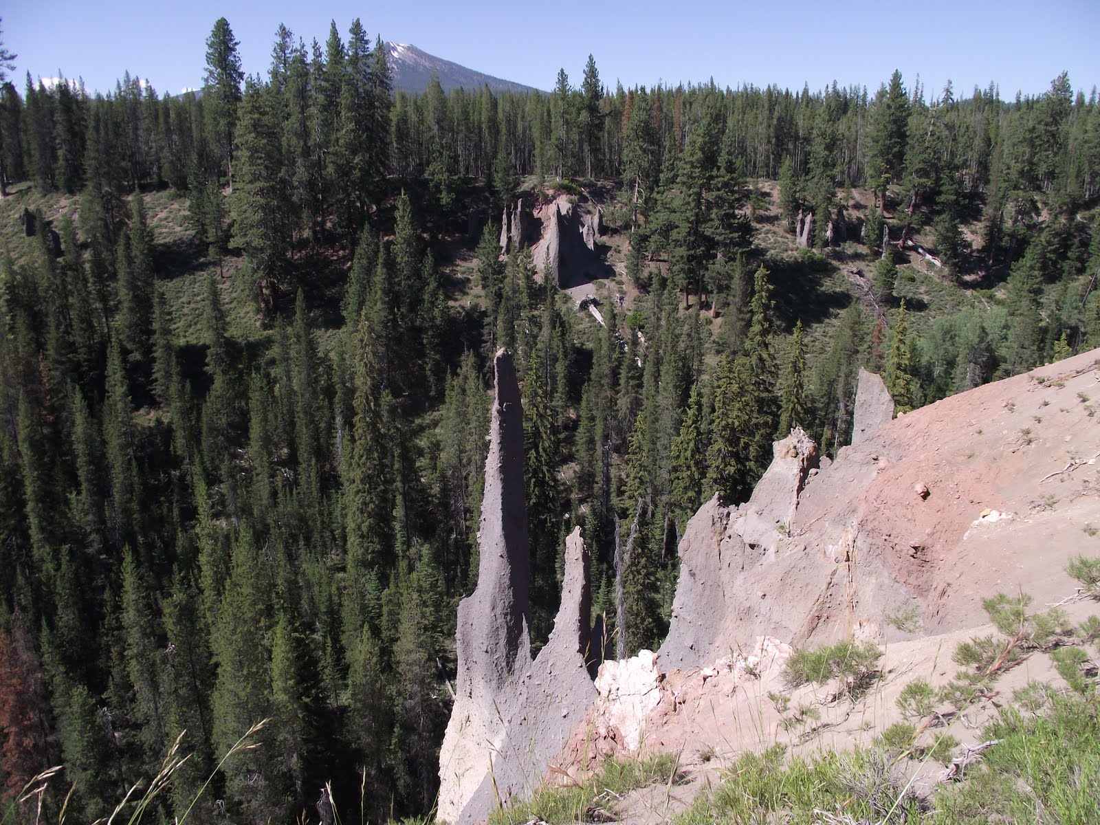 The Pinnacles are a collection of 100 ft. tall,(30 meter) spires. they are being eroded from the canyon wall. The spires are "fossil fumaroles," each marking a place where volcanic gas rose up through hot ash deposits, cementing the ash into solid rock. (Taken from Crater Lake visitors guide.)he